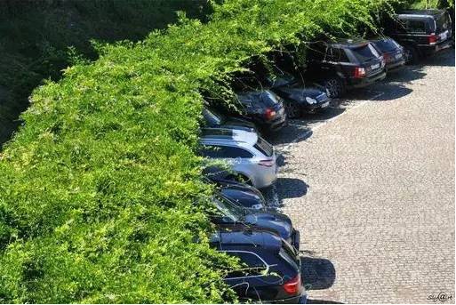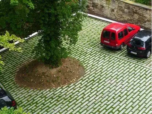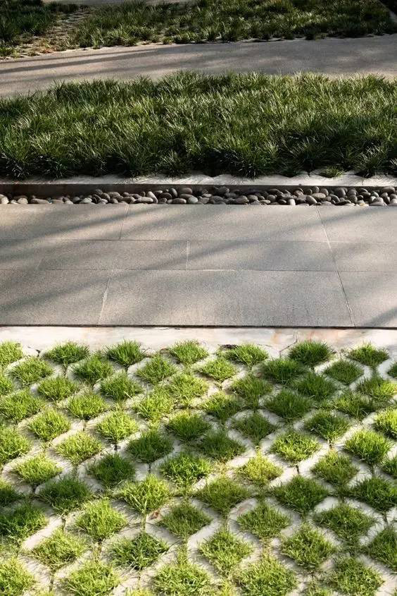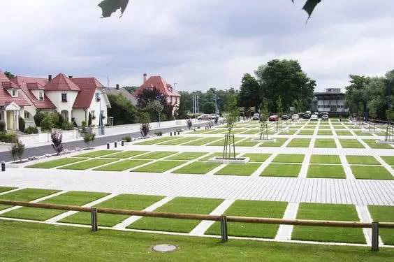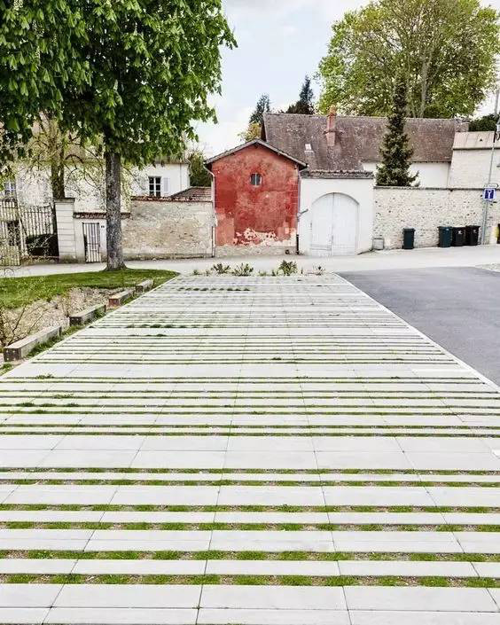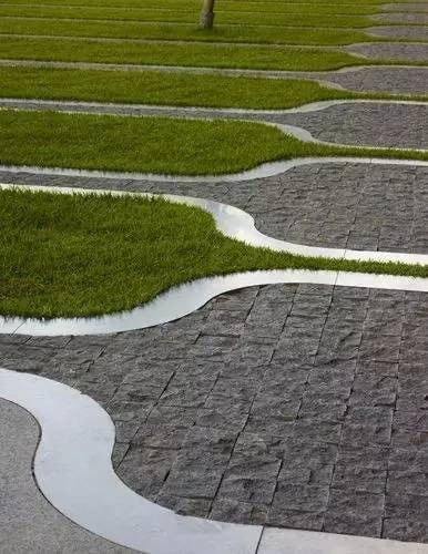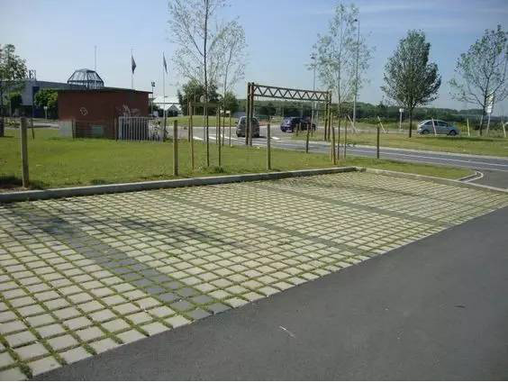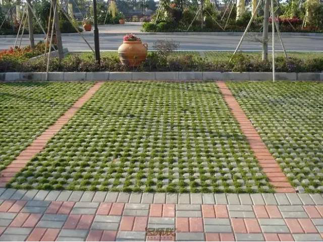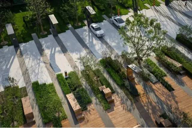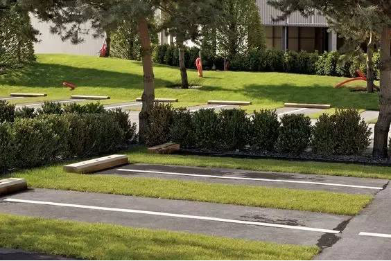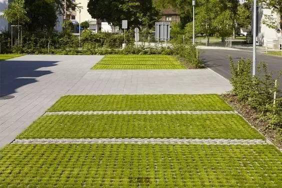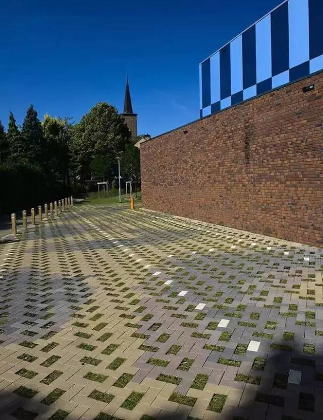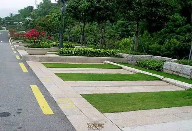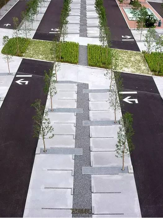 利于更換及修補的防滑鋪裝材料,以及它的透水性,加上鋪設尺寸符合人體工程學,真是人性、環(huán)保、安全而美觀。而停車場周圍的綠植,起到降溫作用,視覺上也美化了場景,愉悅內心,安全出行,再好不過。